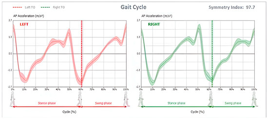 - Symmetry index, which is the percentage of symmetry between the curve of anterior/posterior acceleration during left and right gait cycles, the maximum value of 100 represents ideal symmetry throughout walking, this is displayed in Figure 1.