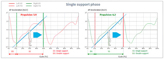 Figure 2. Propulsion during the single support phase is represented by the blue line. The slope indicates the symmetry between both sides where a more vertical line showcases better symmetry between left (red) and right (green) lines.