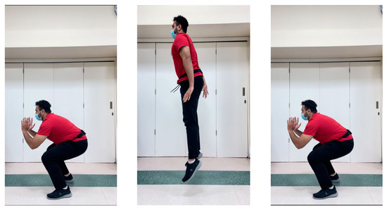 - The participant begins the test in upright position with their hands on the hips and their feet placed in line with the shoulders. They are then instructed to jump by performing a countermovement towards the downward direction and bending their knees by 90°. During the entire course of the test, the trunk should remain upright with hands near the hips (Figure 5).