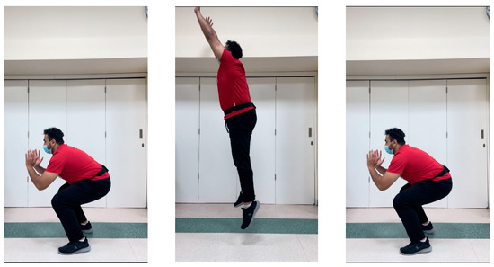 - The participant begins the test in upright position with their hands on the sides and their feet placed in line with the shoulders. They are then instructed to jump by performing a countermovement towards the downward direction and bending their knees by 90°, with the help of using their arms as they extend them upwards. During the entire course of the test, the trunk should remain upright with arms and hands extending upwards in a thrust maneuver (Figure 6).