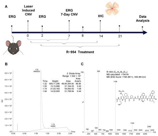 Schematic representation of experimental design of the study. Timeline of the study (A): the R-954 treatment was started immediately after CNV induction on day 0, and continued for 7-, 14- or 21-days in three different experimental groups. ERG was performed before CNV and during the treatment on day 2 and day 7. Choroidal and retinal tissues were collected at the end of the study for immunohistochemistry and confocal microscopy. HPLC and mass spectrometry analyses show mass confirmation and purity (98%) of the synthesized peptide B1R antagonist R-954 (B,C). The molecular formula and mass spectrum (MS) calculated of R-954 are indicated (C). CNV, choroidal neovascularization; ERG, electroretinogram; IHC, immunohistochemistry; R-954, B1R antagonist; MS, mass spectrometry; ESI-MS, Electrospray ionization (positive mode)-mass spectrometry; m/z, mass-to-charge ratio.
