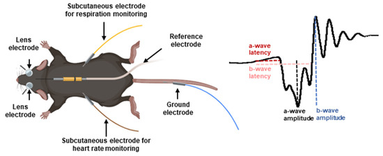 Representation of an anesthetized mouse placed under a Ganzfeld dome with photo stimulator while performing electroretinography. The electrode was positioned on a corneal lens adapted for mice. A reference electrode was located subcutaneously in the forehead and ground electrode in the tail of the mouse. Peak amplitude and latency of a- and b-waves were measured as shown on the schematic representation of an electroretinogram trace (right panel).