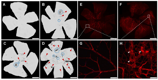 The representative wholemount choroidal maps of non-CNV contralateral control (A), and 7-day (B), 14-day (C) and 21-day (D) post CNV, with visible CNV laser spots (circle) and neovessels clusters (red arrowheads). Retinal maps of non-CNV contralateral control (E) exhibit well defined vasculature and 21-day post CNV (F) demonstrating tangled neovessels formation (white arrowheads). (G,H) are the high magnification images of dashed boxes in (E,F), respectively. Scale bar 1 mm (A–F) and 50 µm (G,H).