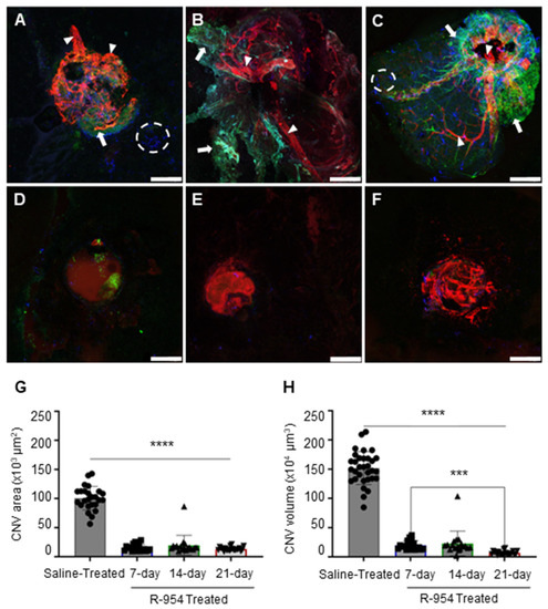 | Saline Treated CNV | R-954 Treated CNV | Saline Treated CNV | R-954 Treated CNV | |||||||||