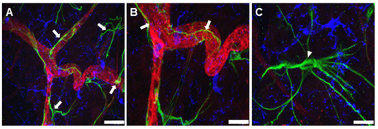 To understand the morphology and cellular expression of B1R, high magnification confocal imaging was performed on the retinas. The presence of B1R-stained elements touching the retinal vascular plexus was observed. There was a clear association between B1R-labelled filopodia-like structures and blood vessels (Figure 6A,B), including astrocytic or Müller cells endfeet-like patterns. B1R labelling was seen on astrocytic cell bodies, featured by flattened cells and a series of fibrous radiating astrocytic endfeet (Figure 6C). Microglial cells were abundantly present in the CNV retina, however there was no co-expression of B1R and Iba-1 positive microglial cells (Figure 6C). Also, the microglial cells were not labelled by the lectin GS-IB4, although this lectin does sometimes label reactive microglia.