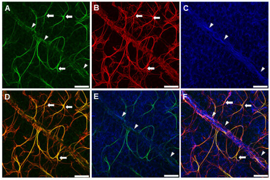Triple immunostaining of wholemount 21-day saline treated CNV retina with anti-B1R antibody (green; (A)); anti-GFAP antibody staining astrocytes and activated Müller cells (red; (B)) and anti-Kir4.1 antibody preferentially staining Müller cells (blue; (C)). An overlay image demonstrating colocalization of B1R and GFAP, showing strong localization of B1R on glial cells (yellow; arrow; (D)). Image indicating co-expression of B1R and Müller cells staining Kir4.1 (white; arrowhead; (E)). Merged image representing colocalization between B1R, GFAP and Kir4.1 (F). Scale bar 20 µm.