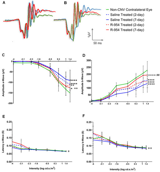 ERG amplitude and peak latency recorded in scotopic conditions demonstrated distinctive changes in the retinal functioning after CNV induction as compared to non-CNV contralateral eye in an intensity-dependent manner (p < 0.0001). Saline-treated CNV eyes show extensive decrease in the a- wave (−41 ± −16 and −34 ± −14 µV vs. −59 ± −21 µV) and b-wave (80 ± 20 and 64 ± 17 µV vs. 117 ± 30 µV) on day 2 and day 7 vs. non-CNV contralateral eye (p < 0.0001). In comparison, R-954 treatment retained close to normal amplitude values of a- (−49 ± −19 and −48 ± −20 µV) and b-wave (82 ± 20 and 101 ± 27 µV) on day 2 and day 7, respectively (p < 0.0001) (Figure 8C,D). In addition, there was a significant difference in the b-wave amplitude values between day 2 and day 7 of R-954 treated CNV eyes, indicating that recovery was greater on day 7 (p = 0.009) (Figure 8D). A significant increase in the ERG latencies of day 7 saline-treated CNV eyes; a-wave (p = 0.003) and b-wave (p = 0.0051) was observed compared to day 7 of R-954 -treated CNV eyes; however no significant difference was noted compared to non-CNV contralateral eye (Figure 8E,F). In addition, we also observed a significant decrease in the amplitude of sum of OPs in the saline treated CNV eyes in day 2 (155 ± 35 µV) and day 7 (89 ± 10 µV), compared to non-CNV eyes (350 ± 63 µV), whereas R-954 treated eyes retained normal OPs values in day 2 (277 ± 49 µV) and day 7 (352 ± 42 µV) (p < 0.0001).