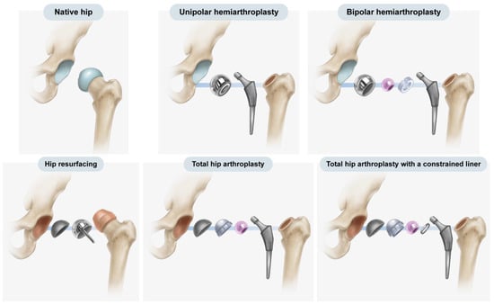 Over the past 50 years, hip arthroplasty has become a common procedure, with hemiarthroplasty and total hip arthroplasty (THA) being the most frequently employed forms of hip arthroplasty. Furthermore, both implants and surgical methods have steadily improved, and different implants are used to treat various conditions in hip arthroplasty, ranging from resurfacing implants to mega-prostheses [1] (Figure 1). Hemiarthroplasty involves the replacement of the native femoral head and neck with an artificial prosthesis, leaving the native acetabulum untouched [2]. In THA, both the femoral and acetabular articular surfaces are replaced with artificial prostheses [3].