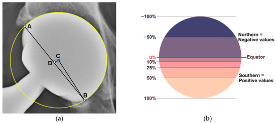While reviewing the image set, each reader evaluated and recorded the status of acetabular sparing, the texture of the cup–bone interface, and the latitude cut deviation for each item. Acetabular sparing was considered “present” if the joint space and subchondral bone plate area were preserved [2,8]. The texture of the cup–bone interface was categorized as either smooth or textured [8]. The latitude cut deviation was graded in dichotomy based on the results of the first part of the investigation. Specifically, if the latitude cut was made around the equator of the outer circle (i.e., a lower percentage of latitude cut deviation), it was deemed to be “near the equator.” If the latitude cut was made markedly below the equator circle (i.e., with a higher percentage of latitude cut deviation), it was considered to have “deviated from the equator” (Figure 4).