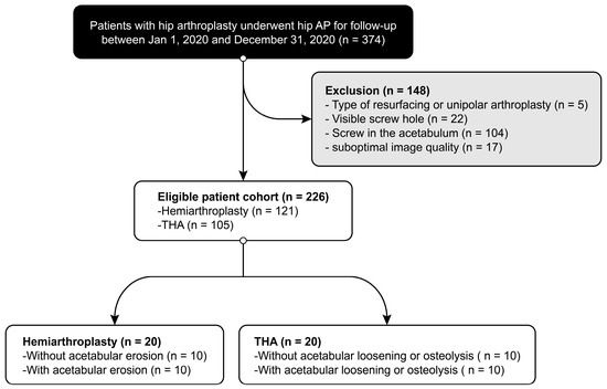 Flowchart illustrating patient inclusion and exclusion. AP, anteroposterior; BPHA, bipolar hemiarthroplasty; THA, total hip arthroplasty.