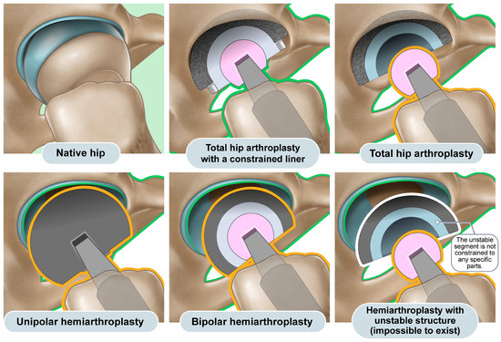 Cross-sections illustrating the relationship between components in various types of hip arthroplasty. The outline color represents the boundaries of components mechanically constrained within the construct. Green indicates a mechanically linked construct to the pelvis, whereas orange indicates a mechanically linked construct to the femur. Upper left: The concave acetabulum articulates with the spherical femoral head to form the native hip joint. Upper middle: The constrained liner comprehensively encases the artificial femoral head, allowing only rotation and preventing displacement, resulting in an axially linked state. Upper right, lower left and middle: In contrast, both THA and hemiarthroplasty leave one articulation unconstrained, allowing for displacement. Lower right: If the cup of the hemiarthroplasty does not adequately encompass the artificial femoral head, resulting in two unconstrained articulating interfaces, the cup–liner construct remains an unstable segment without constraint to either the pelvis or femur.