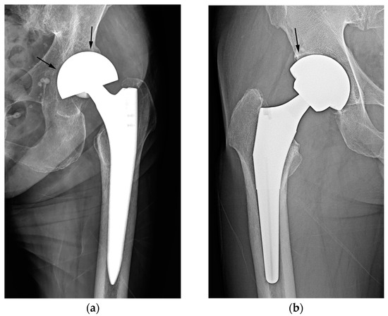 In this present study, discriminating between the two types of hip arthroplasty based on joint space narrowing or widening around the cup and/or preservation of the acetabular subchondral plate yielded the lowest diagnostic performance and inter-reader reliability among the three tested criteria. A preserved subchondral bone plate of the acetabulum and an adjacent joint space can be utilized to distinguish hemiarthroplasty from THA [2,8,19]. Under normal circumstances, this serves as a reliable indicator for distinguishing hemiarthroplasty from THA, as the fundamental difference lies in whether the acetabular articular surface is replaced. Nevertheless, when the acetabular cartilage is worn down to the extent that the outer cup of the hemiarthroplasty contacts or protrudes into the subchondral bone, resulting in acetabular erosion and migration, the absence of the adjacent cartilage joint space could lead readers to mistakenly interpret such cases as an acetabular cup placed in a reamed acetabulum in THA [7,8,19] (Figure 6a). Furthermore, in THA cases, instances of aseptic loosening or osteolysis at the bone–prosthesis interface may be misinterpreted as the adjacent cartilage joint space observed in hemiarthroplasty [2] (Figure 6b).