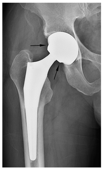- Vanrusselt, J.; Vansevenant, M.; Vanderschueren, G.; Vanhoenacker, F. Postoperative radiograph of the hip arthroplasty: What the radiologist should know. Insights Imaging 2015, 6, 591–600. [Google Scholar] [CrossRef] [PubMed]