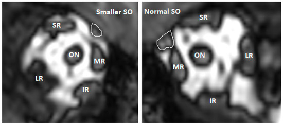 Example of a smaller right superior oblique (SO) muscle in one of the patients with non-syndromic UCS on MRI coronal plane. Abbreviations: SR: superior rectus, MR: medial rectus, LR: lateral rectus, IR: inferior rectus, ON; optic nerve.