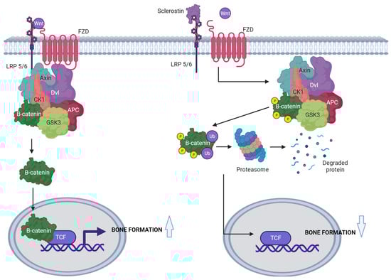 The effect of sclerostin on the Wnt/β-catenin pathway. When the Wnt signalling pathway is not inhibited by sclerostin, it leads to increased bone formation. Sclerostin inhibits the canonical Wnt-signalling pathway through its binding to the Wnt LRP 5/6 co-receptors and leads to decreased bone formation. APC: adenomatous polyposis coli; CK1α: casein kinase 1 α; Dvl: Dishevelled protein; FZD: Frizzled receptor; GSK3: glycogen synthase kinase 3; LRP 5/6: low-density lipoprotein receptor-related protein 5/6; P: phosphorus; Ub: ubiquitin; TCF: transcription factor. Created using BioRender.com (accessed on 16 August 2023).