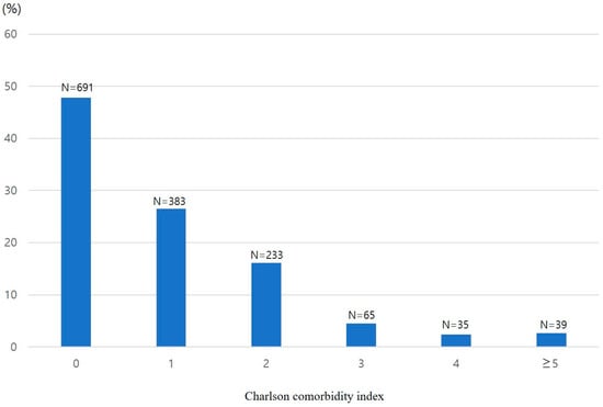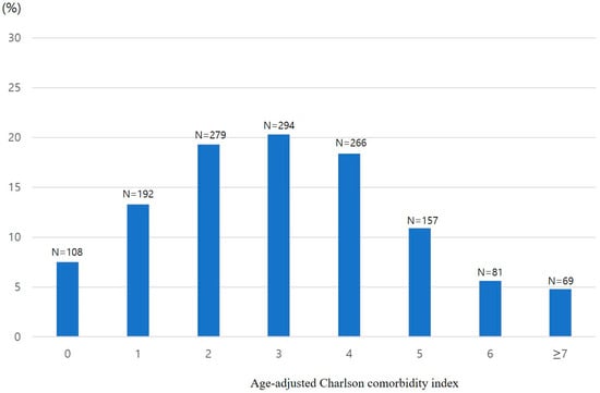 There were a total of 1446 patients. The most common comorbidity was diabetes (21.2%), followed by solid tumors without recurrence (9.7%). Table 1 lists the comorbidities of the patients. According to the CCI, the distribution of the corresponding number of patients and percentages were as follows: 0 points, n = 691, 47.8%; 1 point, n = 383, 26.5%; 2 points, n = 233, 16.1%; 3 points, n = 65, 4.5%; 4 points, n = 35, 2.4%; and ≥5 points, n = 39, 2.7% (Figure 1). Similarly, based on the ACCI, the corresponding number of patients and percentages were as follows: 0 points, n = 108, 7.5%; 1 point, n = 192, 13.3%; 2 points, n = 279, 19.3%; 3 points, n = 294, 20.3%; 4 points, n = 266, 18.4%; 5 points, n = 157, 10.9%; 6 points, n = 81, 5.6%; and ≥7 points, n = 69, 4.8% (Figure 2).