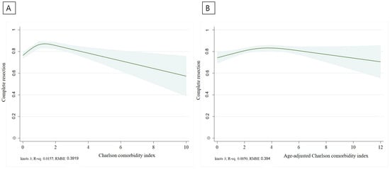 We created a predictive model called restricted cubic splines to determine the incidence of complete resection and complications in patients with high CCI and ACCI scores. Restricted cubic splines serve as a valuable method for schematically analyzing complications and complete resections within the framework of our predictive model [27]. Restricted cubic splines enable substantial flexibility in illustrating the connection between the predictors and outcomes. In this study, we could discern the relationship between CCI and ACCI in relation to complete resection and complication rates.