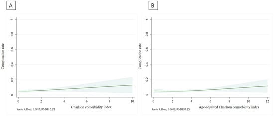 Experiments were conducted using restricted cubic splines with three knots. A restricted cubic spline curve was used to show the predicted probability (solid line) and 95% confidence intervals (shades) to evaluate the association of CCI and ACCI with complete resection and complication rates. Statistical analyses were conducted using Stata/SE 16.1 software (StataCorp LLC., College Station, TX, USA).
