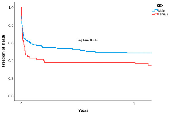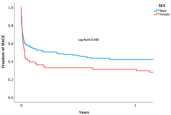 In the setting of acute myocardial infarction, it has been repeatedly shown that differences in treatment remain between sexes [8,9,10], and that women presenting with AMI have higher adjusted early mortality rates [11]. Recent trends have shown increases in rates of hospitalization for women less than 65 years of age experiencing acute coronary syndrome (ACS) [12] and, when compared with men, women receive less medical and invasive therapy when suffering from AMI [10,13], including lower in-hospital use of coronary angiography [14] and PCI [15]. It has been suggested that the disparity may be due to higher baseline risk, atypical presentations, and underestimation of patient risk [14]. Although previous trials, including the SHOCK and SHOCK IABP-II trials, which evaluated the etiology, management, and outcomes of patients who developed CS following ST-elevation AMI (STEMI) have shown that mortality rates are high, no significant sex differences in mortality have been seen [16,17,18]. Identification of sex-related differences in outcomes for patients within this already very high-risk population can allow for changes in practice, such as earlier recognition and intervention, which may help mitigate these differences. The goal of this study was to assess any sex differences in clinical outcomes, including mortality, in patients presenting with acute STEMI complicated by CS and undergoing PPCI.