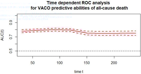 Time-dependent ROC analysis for the VACO predictive abilities of all-cause death.