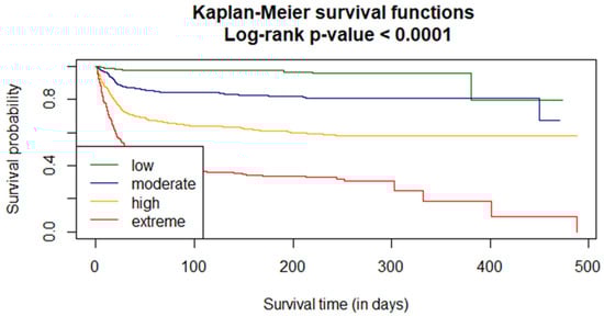 Survival curves were estimated using the Kaplan–Meier functions. The curves were compared using the Log-rank test. A p-value < 0.0001 indicates that the probability of survival in risk groups is significantly different (Figure 3).