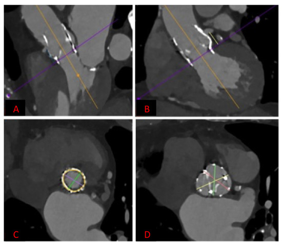 Preprocedural planning with ECG gated medium contrast CT scan. (A) Sizing of the landing zone (Perceval inflow ring) diameters, area and perimeter; (B) aortic root dimensions; (C) right coronary artery take off; (D) left coronary artery take off.