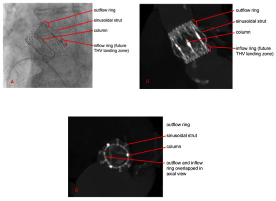 Sutureless bioprosthesis represents an innovative approach for surgical AVR and has been designed to allow faster implantation, reducing CPB and ACC time. This is an advantage for all patients, regardless of the risk profile. Therefore, Sutureless aortic valve implantation might be an alternative treatment option for patients at high-risk for mortality and morbidity after open heart surgery. The follow-up of this bioprosthesis is now long, and there are some cases of valve degeneration [9,10,11,12,13,14,15]. In our opinion, oversizing the prosthesis Perceval valve will not reduce the incidence presence of leakage; conversely, it might be associated with incomplete expansion dilatation of the bioprosthesis sutureless valve with infoldings of the annular portion. Sizing for the device is important as the Perceval is designed to expand to an outer diameter larger than the patient’s measured annular diameter. The expansion of the frame provides the proper interference fit to secure the Perceval in place for stability at physiological pressure, flow and movement. The Perceval bioprosthesis selected for the implant should match the measured diameter of the aortic annulus diameter. Margaryan et al. analyzed 54 patients who underwent Perceval implantation with preoperative contrast-enhanced multidetector-row computed tomography (MDCT). Echocardiographic measurements showed lower accuracy compared to MDCT measurements. MDCT measurements showed higher accuracy compared to echocardiographic measurements. They concluded that, possibly for precise aortic annulus measurement, contrast-enhanced MDCT is preferable [18]. They concluded that MDCT is possibly preferable for precise aortic annulus measurements. Sizing for the device is important as the Perceval is designed to expand to an outer diameter larger than the patient’s measured annular diameter. In a study of our Center, Cerillo et al. investigated the relationship between a computed tomography measure of the degree of prosthesis oversizing and the early hemodynamic and clinical outcomes in patients undergoing AVR with Perceval valve. The degree of oversizing of the implanted sutureless prosthesis was calculated as the ratio between the patients’ aortic annulus cross-sectional area and the ex vivo cross-sectional area of the implanted prosthesis in 151 Perceval patients who underwent preoperative cardiac computed tomography. This value was then entered in a multivariate analysis to ascertain its role as a predictor of early degeneration and increased the postoperative gradient and, therefore, early degeneration. The degree of oversizing of the implanted prosthesis was the most important predictor of increased postoperative prosthesis gradient (odds ratio, 1.264; 95% confidence interval, 1.147 to 1.394; odds ratio, 1.264; p < 0.0001). Interestingly, other relevant factors, such as patients’ body surface area, prosthesis size or patients’ body surface area, were not associated with increased transvalvular gradients. This study demonstrates that excessive oversizing in Perceval patients should be avoided and suggests that a different sizing planning algorithm, possibly based on cardiac computed tomography CT scan, should be developed [19]. Based on this study, since 2017, we have changed our policy, avoiding oversizing and basing the choice of bioprosthesis Perceval size above all with CT data, confirmed with intraoperative sizing. In our experience, 40 patients needed reintervention for structural Perceval bioprosthesis degeneration. Eight patients underwent redo surgery and 32 patients VIV-TAVR. The condition of the eight degenerated bioprostheses that underwent redo surgery is fibrosis, calcification and thickening of the leaflets. After a change of our policy from 2017 to 2023, only two patients had prosthesis degeneration. Before proceeding to VIV-TAVR in Perceval, it is important to properly know its principal structural characteristics. This prosthesis is composed of a self-expandable Ni-Ti alloy stent and bovine pericardium. The stent is fully radiopaque and has the dual task of supporting the valve and fixing it in place; it is composed of an inflow ring and an outflow ring that are connected by columns and sinusoidal struts (Figure 6A–C). The bovine pericardium includes the tissue of the valve and the sealing collar, and it is composed of two sheets of pericardium that wrap the metal stent inside it axially to the supporting structures and around the inflow ring. The inflow ring is clearly visible under CT scan and fluoroscopy and constitutes our THV landing zone. The bovine pericardium that wraps the inflow ring will constitute the interface between the native annulus and the Perceval and between the Perceval and the THV. During the transfemoral procedure, one of the most tricky parts is to cross the Perceval both inside the outflow and the inflow ring. Especially in the case of ascending aorta enlargement, it can occur that the outflow ring is still detached from the aortic wall, and the guide wire can easily pass between it and the outflow ring and then inside the inflow ring. In this situation, it is not possible to advance the THV in place and it is mandatory to check for proper crossing (Figure 7). For this reason, we suggest to floss the full prosthesis with an inflated 12 or 14 × 20 mm balloon (Figure 4). If the inflated balloon is able to reach the left ventricle, the guide wire is in the correct position and it is possible to proceed with the next step of the THV implantation.
