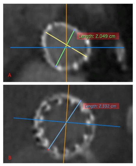 Preprocedural CT scan shows the inflow ring of a degenerated Perceval; a certain level of eccentricity is clearly visible with a sort of rounded triangular shape. (A) Post VIV-TAVIR CT scan of the same prosthesis, we can appreciate a circumferential expansion with minor diameter passing from about 2.05 cm to about 2.3 cm (B).