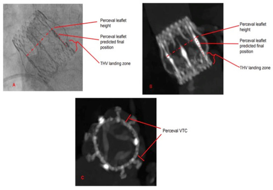 Valve-in-valve transcatheter aortic valve implantation for failed surgical bioprosthesis global experience is definitely increasing year after year [20,21]. In effect, it may offer a rapid and less invasive solution to bioprosthesis degeneration. There is a clear trend of increased use of VIV-TAVR compared to a relative reduction in the use of redo surgical replacement. Majmundar et al. confirm a good performance of VIV-TAVR with lower 30-day mortality in comparison to redo surgical replacement but a higher all-cause readmission rate and mortality in readmitted patients and similar secondary adverse events [21]. The two major adverse events that can compromise the outcome of VIV-TAVR and that are associated with an increased mortality rate and readmissions are substantial coronary artery obstruction and poor hemodynamic performance of the newly constrained THV. Careful selection of patients is mandatory to achieve good clinical performance and to avoid mortality and complications. To obtain this goal, preprocedural planning should forecast and consider how to manage any potential risk factors for coronary obstruction and for poor hemodynamic performance such as shallow and straight aortic root anatomy, low height of coronary artery take off, geometrical anatomy of the degenerated bioprosthesis, presence of globular calcifications, and small size of the surgical prosthesis [20]. Bioprosthesis valve fracture has been proposed to avoid post VIV-TAVR patients prosthesis mismatch that can occur in suboptimal expansion of a THV inside the surgical bioprosthesis [22,23,24]. In our series, we observed that Perceval, due to its self-expandable Ni-Ti alloy stent, keeps the capability of overexpansion up to 2.5 mm even after several years from the implantation and allows for circumferential expansion of the THV (Figure 8). This peculiar Perceval feature may help in preventing post VIV-TAVR patient prosthesis mismatch. To be honest, we have to highlight that, even in our series, we observed a higher postprocedural gradient in patients with a small prosthesis. However, no one is needed for extra post dilatation due to suboptimal hemodynamics. To gain the best THV hemodynamic performance, it is also important to have a proper THV delivery. It is fundamental to manage the height of implantation starting with the Sapien central marker at the level of the distal portion of the Perceval inflow ring (Figure 3) in order to achieve a correct alignment of the proximal edges of both prostheses once the THV is completely foreshortened (Figure 5), avoiding a delivery too deep in the ventricle (Figure 9A,B). However, in the case of deep delivery inside the ventricle, we did not observe any paravalvular leaks, maybe due to the relatively high landing zone offered by Perceval. The risk of coronary artery obstruction is easily predictable by measuring valve-to-coronary distance or virtual THV-coronary distance (VTC) and valve-to-sinotubular junction (VTSJ) distance at the preprocedural CT scan [25]. A VTC < 3 mm is considered to be at high-risk, 3 to 6 mm intermediate risk and > 6 mm low risk. Tarantini, Dvir and Tang have proposed an algorithm to manage VTC < 4 mm and narrow VTSJ in order to plan a conventional VIV-TAVR or to perform a BASILICA or to protect the coronary ostia [26]. In our series of cases, we never had to manage a coronary obstruction or plan a coronary ostia protection strategy. In effect, despite a relatively high leaflet height, Perceval can be considered a low risk prosthesis for this kind of complication due to several structural characteristics. VTC in Perceval is no longer a virtual distance but is a geometrical characteristic of the prosthesis that corresponds to the distance between the columns and the farthest point of the sinusoidal struts. Pericardial leaflets are located intra-annularly and mounted inside the columns system. The final position of the leaflet is predicted by an easily visible radiopaque marker (Figure 10A–C). The presence inside Perceval of several radiopaque markers that can clearly show THV landing zone height and dimensions, aortic root anatomy, final degenerated pericardial leaflet position and height could permit a completely no contrast medium procedure from CT scan planning to THV implantation. This could be extremely important for patients affected by severe renal failure or severe contrast medium allergies. Despite that, in case of very low coronary artery take off, shallow aortic root or very small or straight sinuses of Valsalva, even in Perceval, a VIV-TAVR can be a challenging procedure. A Perceval nitinol stent is composed of several critical structures that can interfere with the THV deployment and function. It is crucial to know the anatomy of the prosthesis in order to avoid any complications. In particular, the presence of the outflow ring must be considered during the phase of valve crossing for several reasons. It is not unfrequent to cross the valve outside the outflow ring (especially in the presence of ascending aorta dilatation), which is a typical pitfall of the valve-in-valve procedure in this type of prosthesis; it is mandatory to check for proper positioning of the guidewire inside the Perceval outflow ring before advancing the THV; in reverse, it is not possible to complete the THV deployment. Perceval is a high frame valve; when using a high frame self-expandable THV, it is crucial to obtain a perfect alignment of the two prostheses in order to avoid stent creep and THV dysfunction. In concomitance with a horizontal aorta, very high trans-prosthetic gradient and vessels tortuosity, it can be challenging to cross the degenerated leaflet and can require some more time and the use of special tools such as hydrophilic guidewire. Despite the fact that the VTC distance in Perceval is a geometric characteristic of the valve (that corresponds to the distance between the columns and the sinusoidal struts) and it is declared to be always > than 4 m