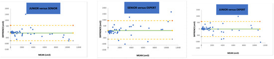 Table 2a shows the inter-observer reproducibility. The overall concordance between the three participants was 0.99 (p < 0.0001) using the Kendall CCC. When confronting two participants with a side-by-side comparison, there were no statistical differences in the SV measurements (p = 0.87, 0.85 and 0.98). The Lin CCCs were 0.99 (0.98–1) between the junior and senior urologists, 0.99 (0.98–0.99) between the senior urologist and the expert endourologist, and 0.99 (0.99–1) between the junior and expert endourologists. A numerical representation of the inter-observer reproducibility using the Bland and Altman method has been designed (Figure 1). The minimum standard deviation (SD) and repeatability coefficient (RC) were observed when comparing the junior endourologist to the expert endourologist as 302 and 593.47, respectively, whereas the maximum SD and RC were observed between the senior and expert urologists (SD 422 and RC 827.11).