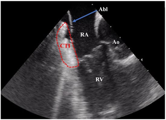- Shimizu, Y.; Yoshitani, K.; Murotani, K.; Kujira, K.; Kurozumi, Y.; Fukuhara, R.; Taniguchi, R.; Toma, M.; Miyamoto, T.; Kita, Y.; et al. The deeper the pouch is, the longer the radiofrequency duration and higher the radiofrequency energy needed—Cavotricuspid isthmus ablation using intracardiac echocardiography. J. Arrhythm. 2018, 34, 410–417. [Google Scholar] [CrossRef]