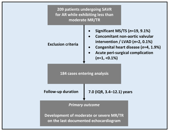 Aortic regurgitation (AR) is a condition in which the aortic valve (AV) fails to prevent systemic blood from back flowing into left ventricle (LV) during diastole. Constituting one of the most common valvular diseases in adults worldwide, AR usually manifests as a slowly progressive disease characterized by a gradual increase in LV volume load, a compensatory rise in chamber size and mass (i.e., eccentric remodeling and hypertrophy), and finally biventricular malfunction—ultimately translating to clinical heart failure (HF). At present, the definite treatment of unrepairable significant AR accompanied by signs or symptoms of cardiac dysfunction is surgical AV replacement (SAVR). While possible, addressing additional valvulopathies at the time of operation comes at the price of a lengthier procedure, potential complications, and higher costs, all of which could outweigh any theoretical benefit of a one-time multivalvular intervention. Yet, considering the worse prognosis and increased mortality associated with the co-presence of significant AR and mitral and/or tricuspid regurgitation (MR and/or TR) [1,2,3], current position papers and practice guidelines advocate the latter’s correction in parallel to SAVR [4,5,6]. Still, there is no consensus regarding the management of non-significant (i.e., less than moderate) MR and/or TR at the time of SAVR for AR, reflecting the paucity of data on the natural history of these valvular disorders in the context of AR, as most studies to date have focused on patients with either stenotic or mixed (rather than regurgitant) AV pathologies [7,8,9,10,11]. As a first step towards improving the decision-making process in this area of uncertainty, we examined the frequency of less than moderate MR or TR deterioration following SAVR for AR and further evaluated predictors for its occurrence, all using a large and contemporary database.