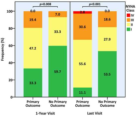 The study cohort was analyzed in its entirety and based on the occurrence of the primary outcome. Variables were reported as frequencies and percentages, medians and interquartile ranges (IQRs), or means and standard deviations. Inter-group differences were evaluated using Pearson’s chi-square, Fisher’s exact, Mann–Whitney U, or Student’s t tests, as suitable. Change over time in the NYHA class was assessed by the McNemar test.