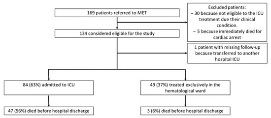 We excluded patients who were not eligible for the ICU treatment due to their clinical condition and poor prognosis defined by a multidisciplinary team composed of hematologists and intensivists. We also excluded those patients who immediately died after the MET referral and for which the MET was alerted for the first time for a cardiac arrest.