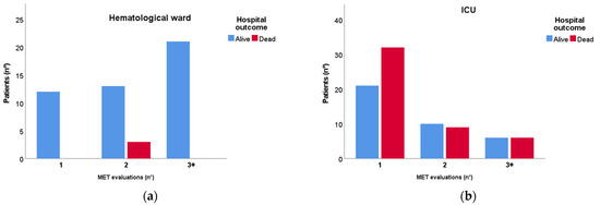 Mortality distribution between 1, 2, and 3 or more (3+) MET evaluations in patients treated exclusively in the hematological ward (a) and in those admitted to the ICU (b). MET: Medical emergency team; ICU: Intensive care unit.