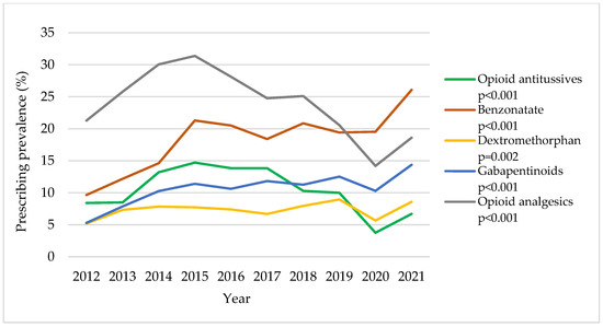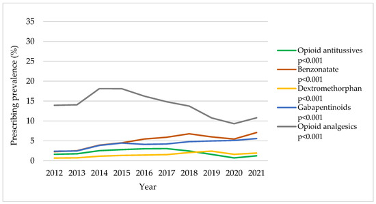 Among CC patients (Table S2 and Figure 1), there were significant increasing trends in benzonatate use (from 9.6% in 2012 to 26.1% in 2021; adjusted p < 0.001), dextromethorphan use (from 5.2% in 2012 to 8.6% in 2021; adjusted p = 0.002), and gabapentinoid use (from 5.3% to 14.4%; adjusted p < 0.001). Opioid antitussive use increased until 2015 and then decreased thereafter (8.4% in 2012, 14.7% in 2015, and 6.7% in 2021; adjusted p < 0.001). The trend in opioid analgesic use showed a similar trend as opioid antitussives but with a greater overall prescribing prevalence (21.3% in 2012, 31.4% in 2015, and 18.6% in 2021; adjusted p < 0.001). Overall, our analysis reveals increasing trends in the prescribing prevalence of medications of interest between 2020 and 2021.