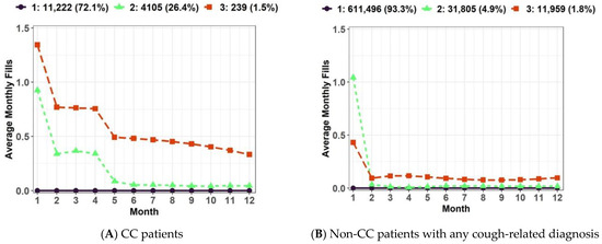 We identified three distinct CM utilization trajectories in CC patients (Figure 3); (1) Group 1: no CM use (n = 11,222; 72.1%), (2) Group 2: declining CM use (n = 4105; 26.4%), and (3) Group 3: chronic CM use (n = 239; 1.5%). We identified three distinct CM utilization trajectories in non-CC patients with any cough-related diagnosis (Figure 3); (1) Group 1: no CM use (n = 611,496; 93.3%), (2) Group 2: declining CM use (n = 31,805; 4.9%), and (3) Group 3: chronic minimal CM use (n = 11,959; 1.8%).