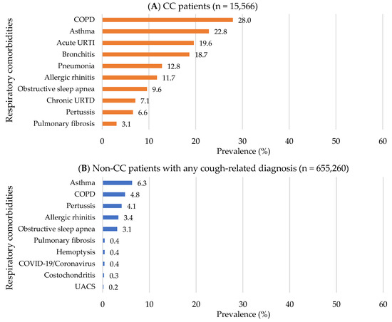 Top 10 pre-index respiratory comorbidities: 2012−2021 OneFlorida data. (A) In CC patients; (B) In non-CC patients with any cough-related diagnosis. Abbreviations: CC: Chronic Cough; COPD: Chronic Obstructive Pulmonary Disease; URTI: Upper Respiratory Tract Infection; URTD: Upper Respiratory Tract Disease; COVID-19: Coronavirus Disease caused by the SARS-CoV-2 virus; UACS: Upper Airway Cough Syndrome.