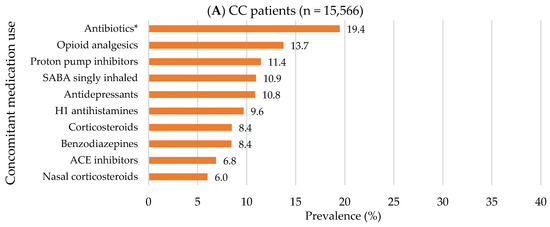 Compared to non-CC patients with any cough-related diagnosis, CC patients were more likely to be older (mean age for CC vs. non-CC patients: 53.9 ± 18.2 vs. 46.3 ± 19.4 years), female (70.2% vs. 68.6%) and to have Medicare as a major payer (48.1% vs. 31.1; all p < 0.001; Table S3). In addition, CC patients had approximately two-fold higher healthcare service use: ≥1 hospitalization (25.7% vs. 13.5), ≥2 ED visits (33.0% vs. 17.4%), and ≥5 outpatient visits (64.2% vs. 35.2%; all p < 0.001; Table S3). The top three most common pre-index respiratory comorbidities in CC patients were chronic obstructive pulmonary disease (COPD) (28.0%), asthma (22.8%), and acute URTIs (19.6%), while the top three for non-CC patients were asthma (6.3%), COPD (4.8%), and pertussis (4.1%; Table S3 and Figure 4). The top three most common pre-index non-respiratory comorbidities were the same for both groups but with a higher prevalence in CC patients compared to non-CC patients as follows: musculoskeletal disorders (57.5% vs. 33.8%), hypertension (55.0% vs. 29.6%), and coronary artery disease (28.9% vs. 16.8%; all p < 0.001; Table S3 and Figure 5). In addition, CC patients had a higher Elixhauser comorbidity index than non-CC patients (1.7 ± 1.9 vs. 0.7 ± 1.3; p < 0.001; Table S3). Overall, concomitant medication use was prevalent in CC patients compared to non-CC patients (Table S3 and Figure 6). The top three most frequently used pre-index concomitant medications in CC patients were antibiotics for respiratory conditions (19.4%), opioid analgesics (13.7%), and proton pump inhibitors (11.4%), while the top three for non-CC patients were antibiotics for respiratory conditions (10.6%), opioid analgesics (8.2%), and antidepressants (5.1%). In addition, CC patients with chronic CM use had a substantial burden of respiratory/non-respiratory comorbidities, healthcare utilization, and concomitant medication use than other trajectory groups in the pre-index period (Table S4). Non-CC patients with any cough-related diagnosis having chronic minimal CM use had an increased concomitant medication use compared to other trajectory groups in the pre-index period (Table S5).