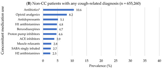 Top 10 pre-index concomitant medication use: 2012−2021 OneFlorida data. (A) In CC patients; (B) In non-CC patients with any cough-related diagnosis. Abbreviations: CC: Chronic Cough; SABA: Short-acting Beta-agonist; H1: Histamine-1 receptor; ACE: Angiotensin Converting Enzyme; H2: Histamine-2 receptor. * Antibiotics for respiratory conditions.