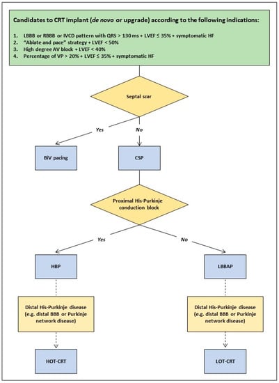 Indeed, in a mechanistic study with simulated ventricular activation on 24 4-chamber heart geometries, including His–Purkinje systems with proximal LBBB, Strocchi et al. [] documented that septal scar and severe left ventricular His–Purkinje conduction disease attenuate the benefits of CSP, whereas BiV stimulation alone, in case of septal scar, or in addition to CSP as HOT-CRT or LOT-CRT, in case of severe left ventricular His–Purkinje conduction disease, would significantly improve biventricular activation time. These experimental results support the importance of maintaining conventional epicardial left ventricular stimulation as an option in specific conditions and highlight the concept of an individualized approach for CRT delivery based on the underlying electrical and myocardial disease. Based on these observations provided by Strocchi et al. [] and the evidence from the clinical studies published so far [,,,,,,], we might tentatively propose a decision tree for CRT delivery in heart failure patients who are CRT candidates according to the current recommendations [,], which is shown in Figure 2. In particular, BiV pacing should be adopted in cases of septal scars to overcome distal blocks as the consequence of a non-viable His–Purkinje system at the septal level that makes CSP ineffective. However, it should be noted that in the case of a septal scar located at a basal level only, posterior fascicular pacing can be attempted by targeting the mid and posterior septum, as previously reported by Ponnusamy SS et al. []. Moreover, the location of the conduction block at the His–Purkinje level is not completely predictable by the surface QRS morphology, as also recently confirmed in a study by Upadhyay GA et al. [], where the traditional 12-lead ECG criteria for the LBBB pattern [] were insufficient for predicting the response to His bundle pacing alone. Therefore, the site of the conduction block can be assessed precisely by using intracardiac data only, and this evaluation should be performed intraoperatively in order to choose between His bundle pacing or LBBAP. Finally, in the presence of distal His–Purkinje disease (e.g., distal bundle branch block or Purkinje network disease), an optimized CRT approach, such as HOT-CRT or LOT-CRT, should be attempted to achieve a greater electrical resynchronization that could not be provided by CSP alone in these specific conditions.