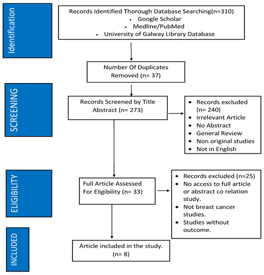 Figure 1 demonstrates the eligibility process in the literature review. Ultimately, in this review, eight studies focusing on modalities used in detecting cancer-caused cardiotoxicity met eligibility criteria [60,61,62,63,64,65,66,67], with all eight populations having breast cancer from stages one to three. The characteristics of these papers can be found in Table 2, with a summary of study outcomes in Table 3. Several common findings emerged from these studies, highlighting the importance of early detection and monitoring of cardiotoxic effects in patients undergoing chemotherapy or targeted therapy.