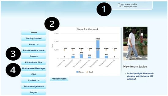 Screenshot of web-based intervention home page. Components include: (1) individualized daily step count goals, (2) iterative feedback on daily step counts objectively measured with a Fitbit, (3) social support via an online forum, and (4) educational tips and motivational messages.