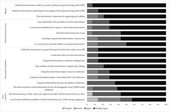 Most of the patients were white (n = 13, 87%), all were male (n = 15, 100%), had a mean age of 73.5 (SD = 8.0), and mean pack years = 45.4 (SD = 23.48). The patients’ median modified Medical Research Council (MMRC) dyspnea score was 3.00 (IQR = 3). Their detailed sample characteristics are displayed in Table 1. Overall, the patients rated the usability of the intervention as high, with median domain scores ≥4.50 out of 5.00. The overall usability score median was 5.00 (IQR = 1.00). The patients agreed that the intervention was impactful (median = 5.00, IQR = 0.00), useful (median = 5.00, IQR = 0.00), easy to use (median = 5.00, IQR = 1.00), and felt they had a high sense of user control over the intervention (median = 4.50, IQR = 1.25). Figure 2 details the participant responses to the individual survey items.