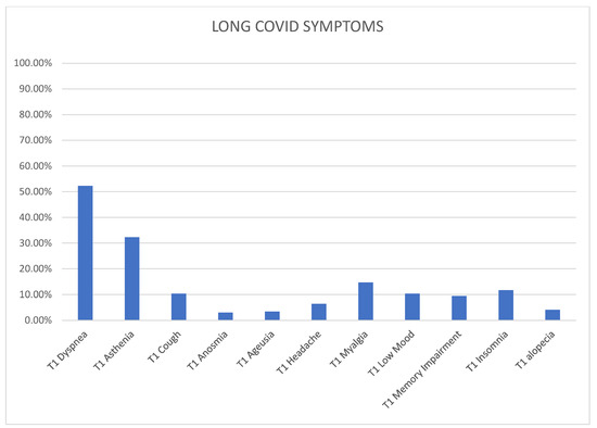 The median number of total symptoms among the Long COVID patients was 1 (ranging from 0 to 2). Graph number 1 illustrates the most commonly reported symptoms at T1-time among those who developed Long COVID. Dyspnea was the most prevalent symptom, affecting 52.3% of patients, followed by asthenia (32.3%), myalgia (14.7%), insomnia (11.7%), low mood (10.3%), memory impairment (9.4%), headache (6.4%), cough (10.3%), alopecia (4.1%), anosmia (3.0%), and ageusia (3.4%).