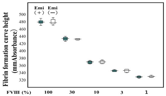 Standard curve for the FVIII and FVIII-like activity in normal reference plasma from healthy volunteers with and without emicizumab. Emi—emicizumab; FVIII—coagulation factor FVIII; closed box—FVIII activity with emicizumab (final concentration—0.15 mg/mL); open box—FVIII activity without emicizumab. Standard curves (Emi(+), Y = 0.284X − 94.3; Emi (−), Y = 0.291X − 96.7).