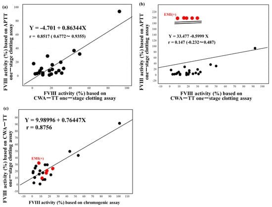 Correlation between the FVIII and FVIII-like activity based on APTT one―stage clotting assay using the APTT and CWA―thrombin time (a), without emicizumab and (b), with emicizuma (b) and between the FVIII activity based on a one―stage clotting assay using the CWA―thrombin time and a chromogenic assay (c). FVIII—coagulation factor FVIII; CWA—clot waveform analysis; APTT—activated partial thromboplastin time; TT—thrombin time; Emi—emicizumab; red symbol—plasma with emicizumab.