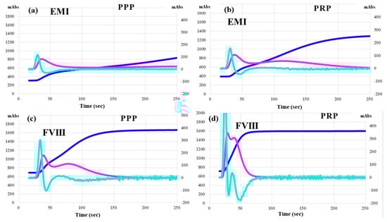 CWA—TT in a hemophilia patient treated with emicizumab (a,b) or FVIII concentrate (c,d). CWA—clot waveform analysis; TT—thrombin time; navy line—fibrin formation curve; FFH—fibrin formation height; pink line—1st derivative curve (velocity); 1st DPH—first derivative peak height; light blue—2nd derivative curve (acceleration); 2nd DPH—second derivative peak height; PPP—platelet poor plasma (a,c); PRP—platelet-rich plasma (b,d); EMI. Emicizumab; FVIII—coagulation factor FVIII reagent.