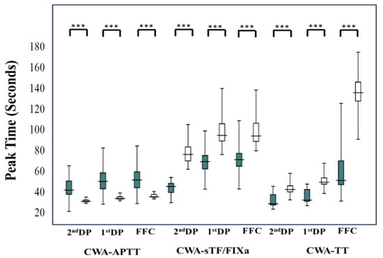 Peak times of CWA-APTT, CWA-sTF/FIXa, and CWA-TT in hemophilia patients treated with FVIII concentrate. CWA—clot waveform analysis; APTT—activated partial thromboplastin time; sTF/FIXa—small amount of tissue factor-induced FIX activation assay; TT—thrombin time; FFC—fibrin formation curve; 1st DP—1st derivative peak; 2nd DP—second derivative peak; ***—p < 0.001; closed box—hemophilia patients treated with FVIII concentrate; open box—healthy volunteers.