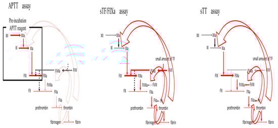 Differences among APTT, sTF/FIXa, and sTT assays. APTT—activated partial thromboplastin time; sTF/FIXa—small amount of tissue factor-induced FIX activation assay; sTT—small amount of thrombin time; red arrow—coagulation process; open red arrow—thrombin burst.